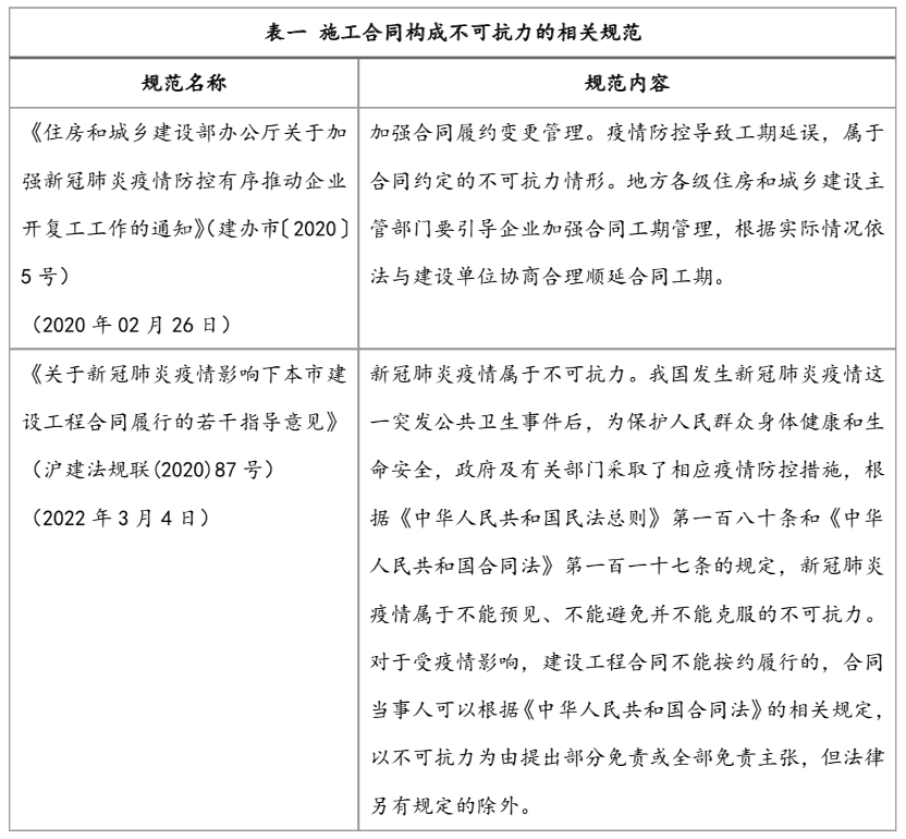 新冠疫情可能导致施工合同不能按约履行,可以构成不可抗力。我们对疫情下施工合同构成不可抗力的相关规范进行了梳理,如下表一: