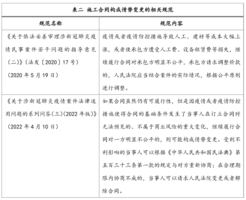 新冠疫情除了导致施工合同不能按约履行外,还可能导致施工合同继续履行会对一方当事人明显不公,我们对新冠疫情下施工合同构成情势变更的相关规范进行了梳理,如下表二: