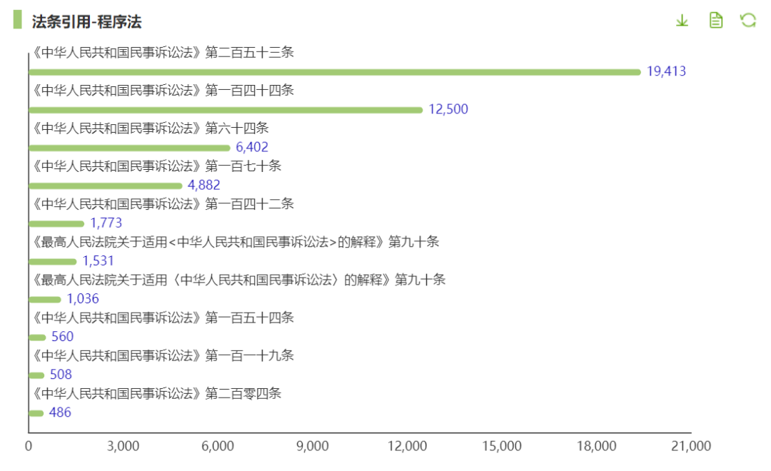 该类案件中援引的程序性法条主要集中在《民事诉讼法》之中,其中引用量最多的三个法条包括:《民事诉讼法》第二百五十三条,该条规定了迟延履行责任的承担问题;《民事诉讼法》第一百四十四条,该条规定了缺席判决制度;《民事诉讼法》第六十四条,该条规定了举证责任的承担问题。