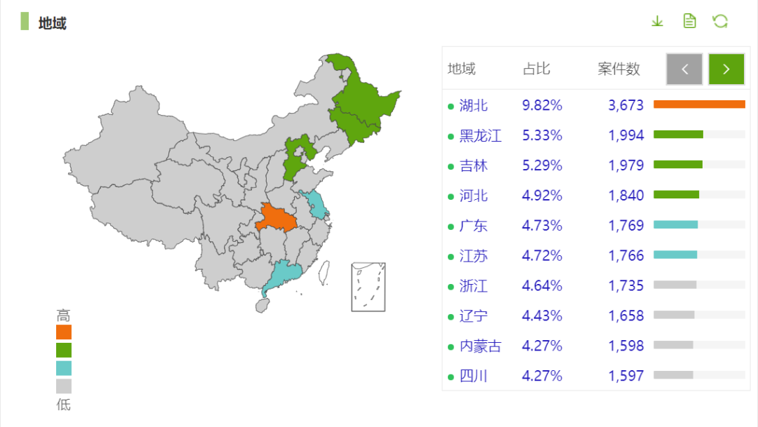 空间上呈点状分布样态,但主要还是集中在中东部地区,其中湖北、黑龙江、吉林三省案件数最多,经济较为发达的广东、江苏和浙江等地案件占比也比较高。