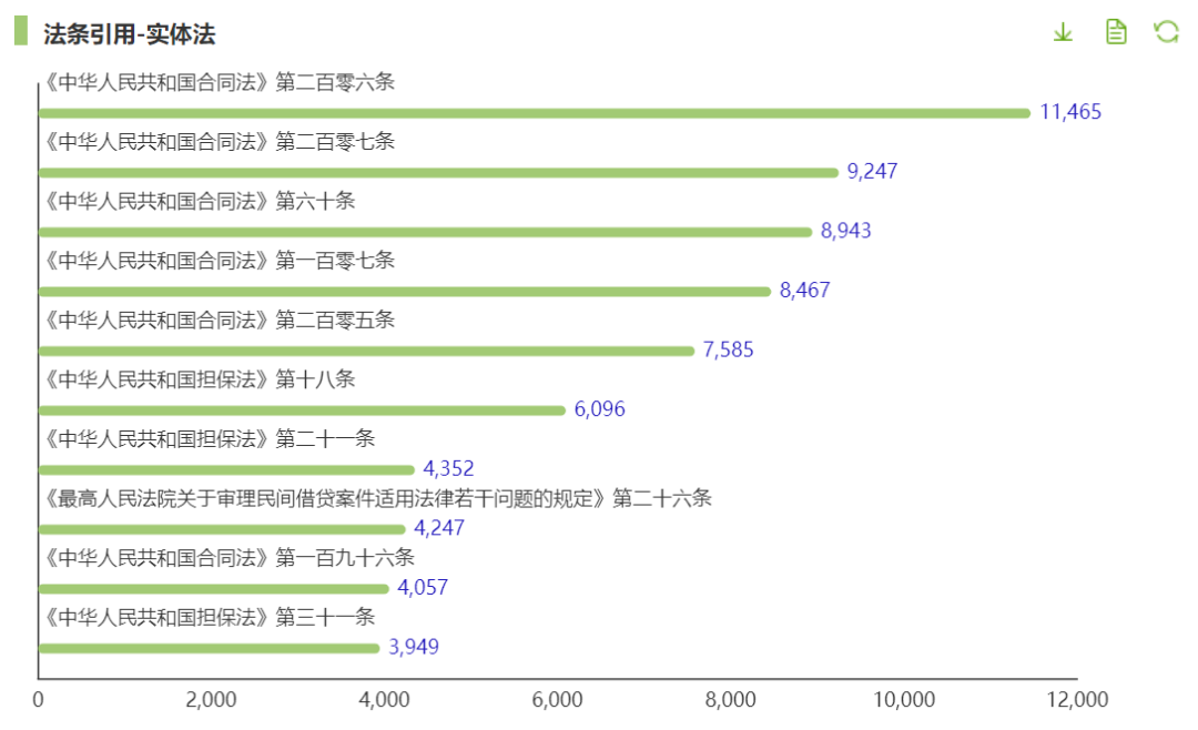该类案件中援引的实体性法条主要集中在《合同法》和《担保法》之中,其中引用量最多的三个法条包括:《合同法》第二百零六条,该条规定了借款的返还期限;《合同法》第二百零七条,该条规定了逾期利息的支付问题;《合同法》第六十条,该条规定了严格履行和诚实信用原则。